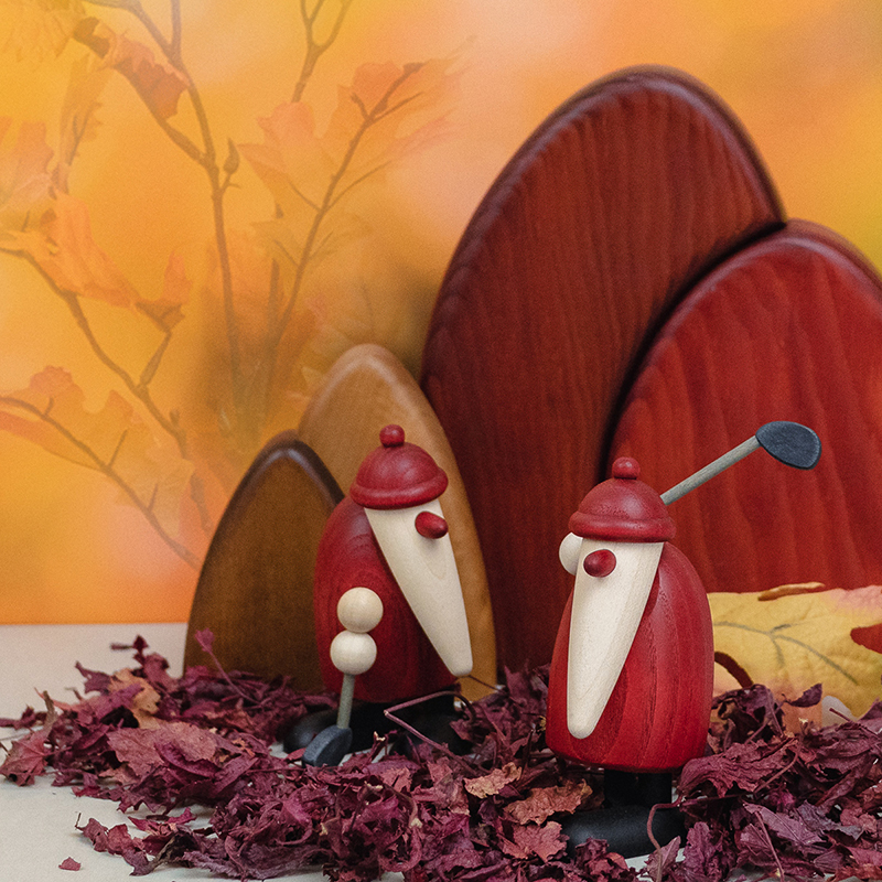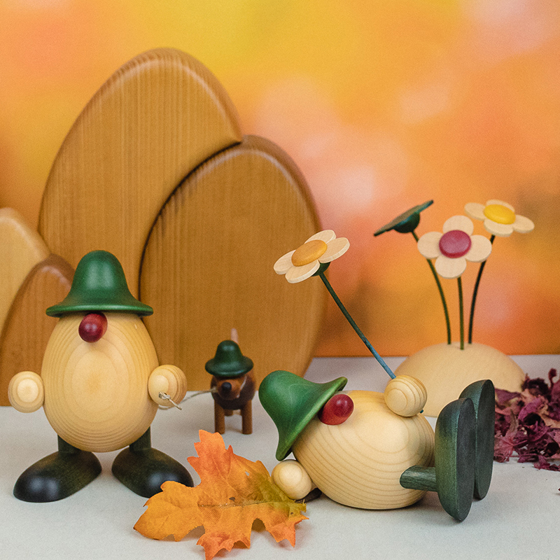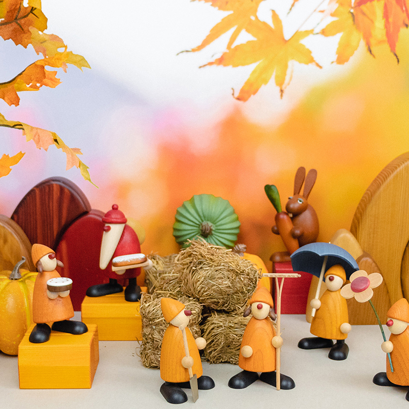 Hinter dem rechten Schaufensterglas unserer Seiffener Ladengalerie hält heute die dritte Jahreszeit ebenfalls Einzug. Während draußen der Regen gegen die Scheibe trommelt, wandern unsere fröhlichen-gelben Gratulantenkinder an ihren Schaufensterplatz und feiern zwischen Kürbisen und Heubündeln Erntedank. Mit Trockenübungen halten sich die beiden Weihnachtsmänner für den Golfsport fit und veranstalten fast ein Weinlaubgestöber, wogegen die kugelrunden Eierköpfe entspannt in den Seiffener Frühherbst blicken. 🍃🍁🍂