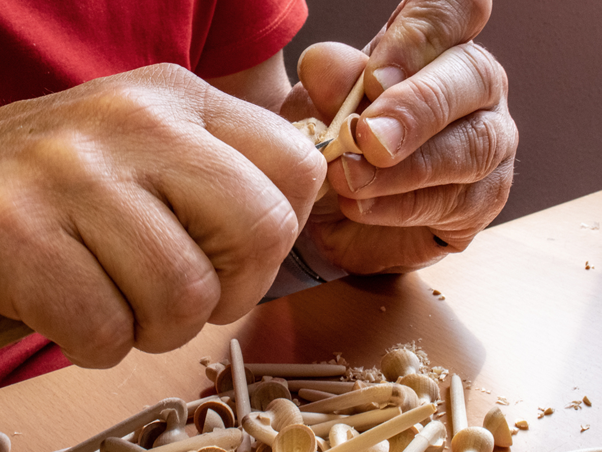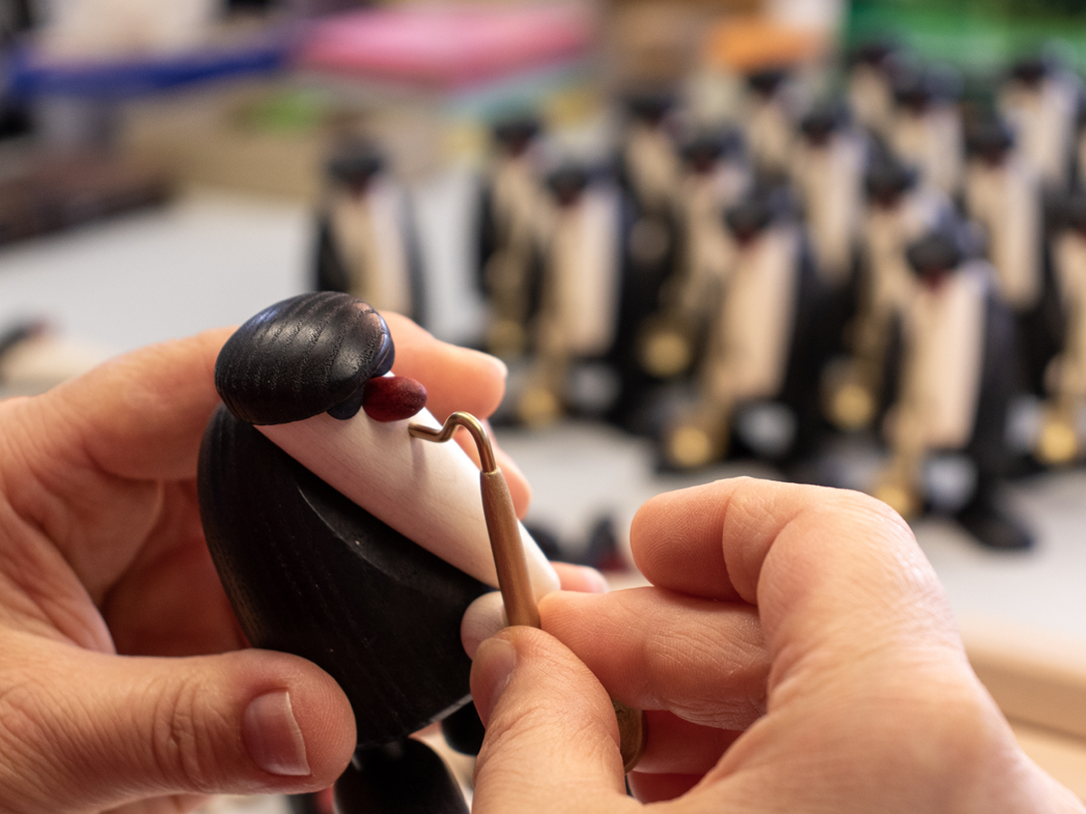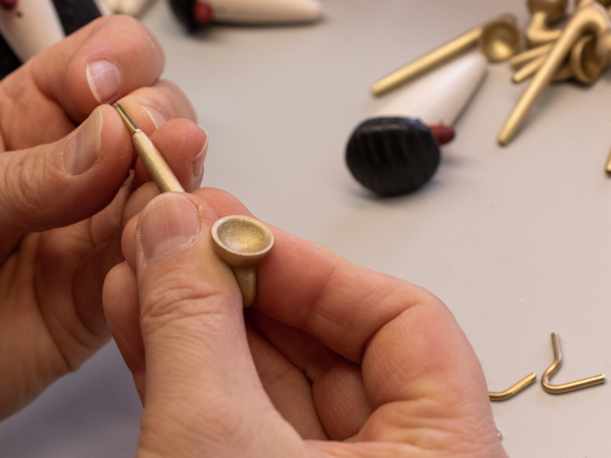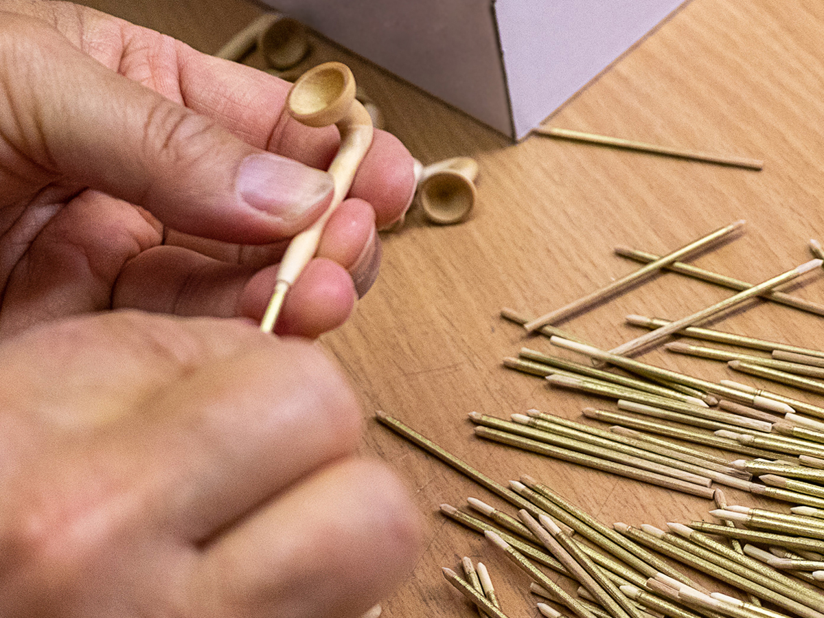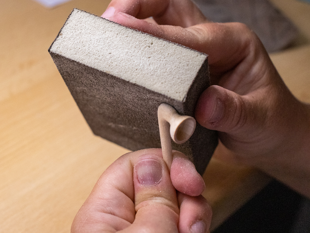 12. Zuletzt erhalten die Instrumente einen feinen, matt-satinierten Überlack. Nach der Trocknungsphase wird jedem Instrument das Mundstück am oberen Korpusende in die vorbereitete Bohrung eingeleimt und einem passionierten Musiker in die Hand gegeben.