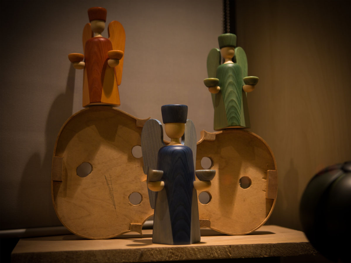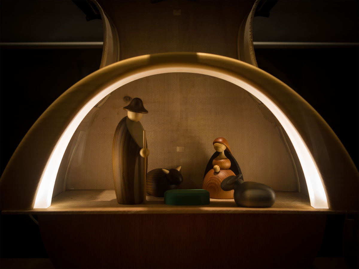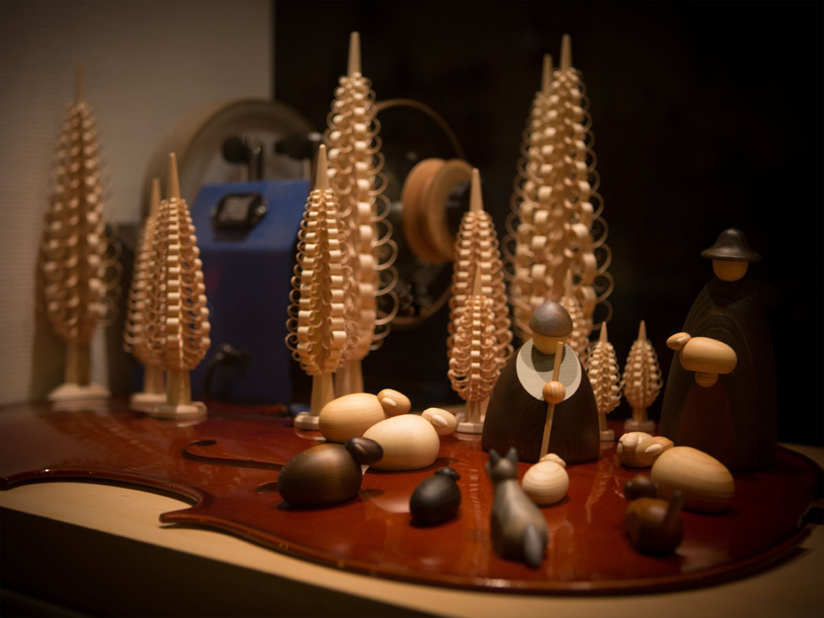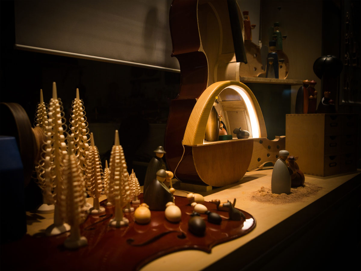 In seinem Schaufenster gehen unsere Krippenfiguren mit den Teilen der Musikinstrumente eine Symbiose der besonderen Art ein. Wir finden es wunderschön…