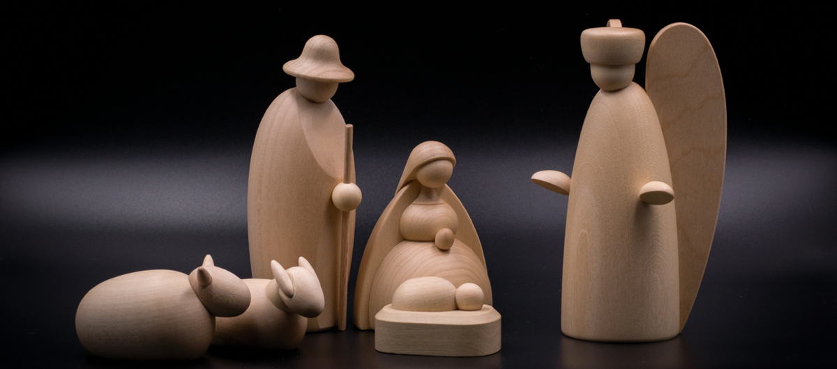 The figures of the small nativity scene in natural are crafted of the finest limewood and maple wood and finished with a wax varnish hand-pleasing. The standing figures are approximately 4.7 inches high. The small nativity scene figures in natural are no longer produced, which is why only a few figures are still available.