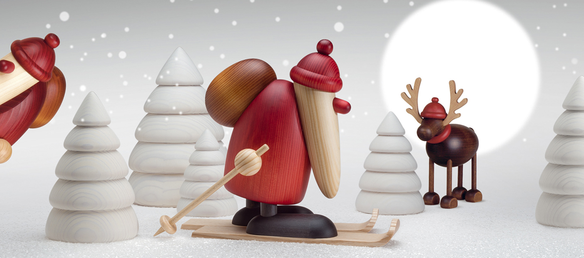 The large Santa Claus figures are turned exclusively from local spruce and have an endearing wit and charm. The standing figures are approximately 7.5 inches high. They are available in a wide variety of designs and can be combined with the small Santa Claus figures and trees.