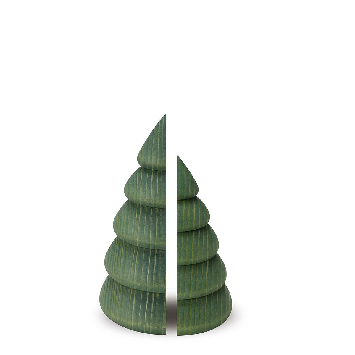 Turned by hand on the lathe from a single piece of spruce and then cut in half, these trees make perfect background decorations for Christmas scenes. A special wax finish gives the tree its characteristic green colour and at the same time brings out the exceptional beauty of the grain.