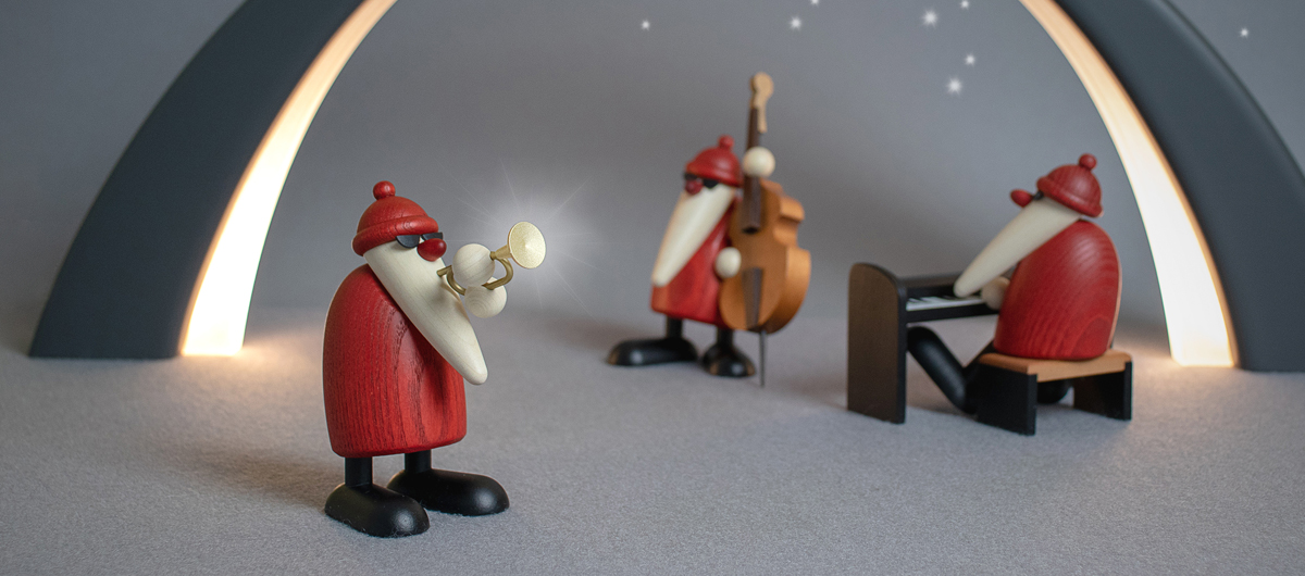 Our musicians don't just create a jazz club atmosphere in Christmas parlors. For all fans of vocals, keys or strings, they are a special and individual gift all year round. Designed as a “combo”, our Santa Claus band also offers several gift-giving occasions for collectors.