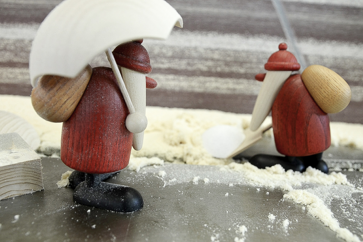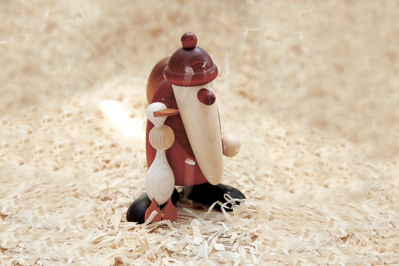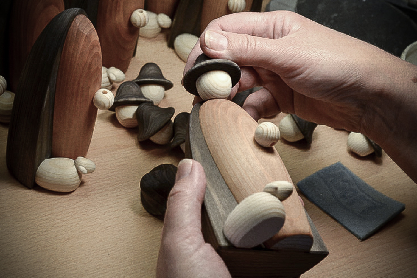 The filigree first cuts as well as choosing and assembling the turned components – that is even in the third millennium pure handicraft by concentrated working people who work with joy and passion. The grain of each component is aligned on one another consecutively. Depending on the figure, the glue-laminated bodies are getting stained, scumbled and then sanded by hand. With trained movements of the hand, fine sandpaper and patience, the basis for the later fine sanding is created. A further scumble with polish or varnish follows, which makes the gently sanded shape shining. The brand mark, that is applied in the end, reveals every small figure recognizable as originals from our manufacture.