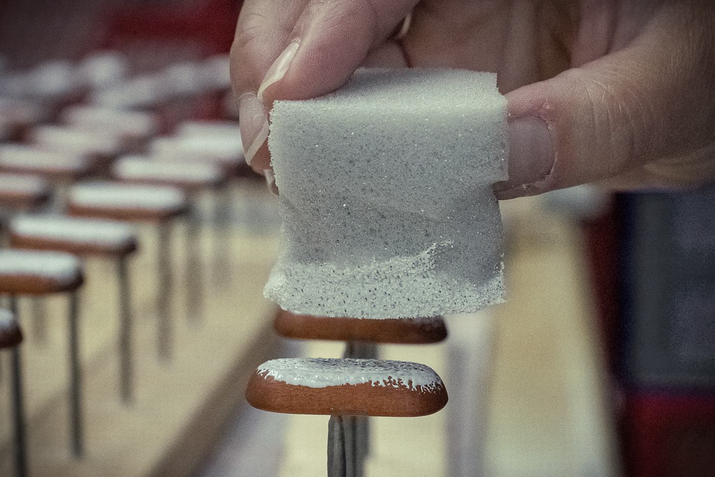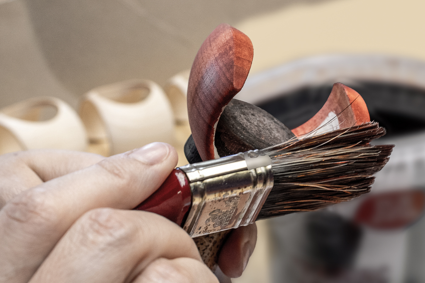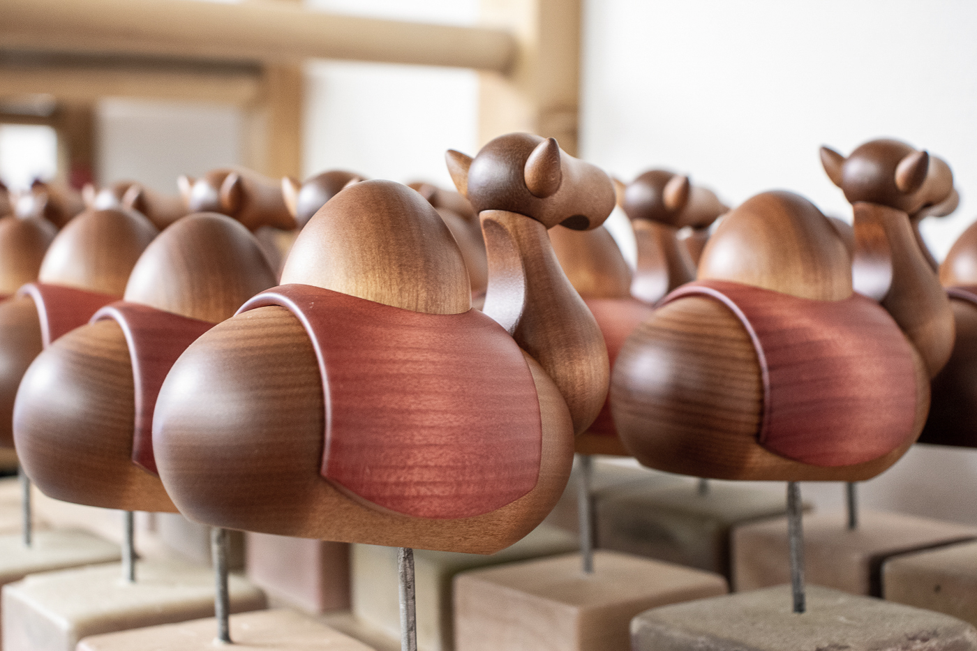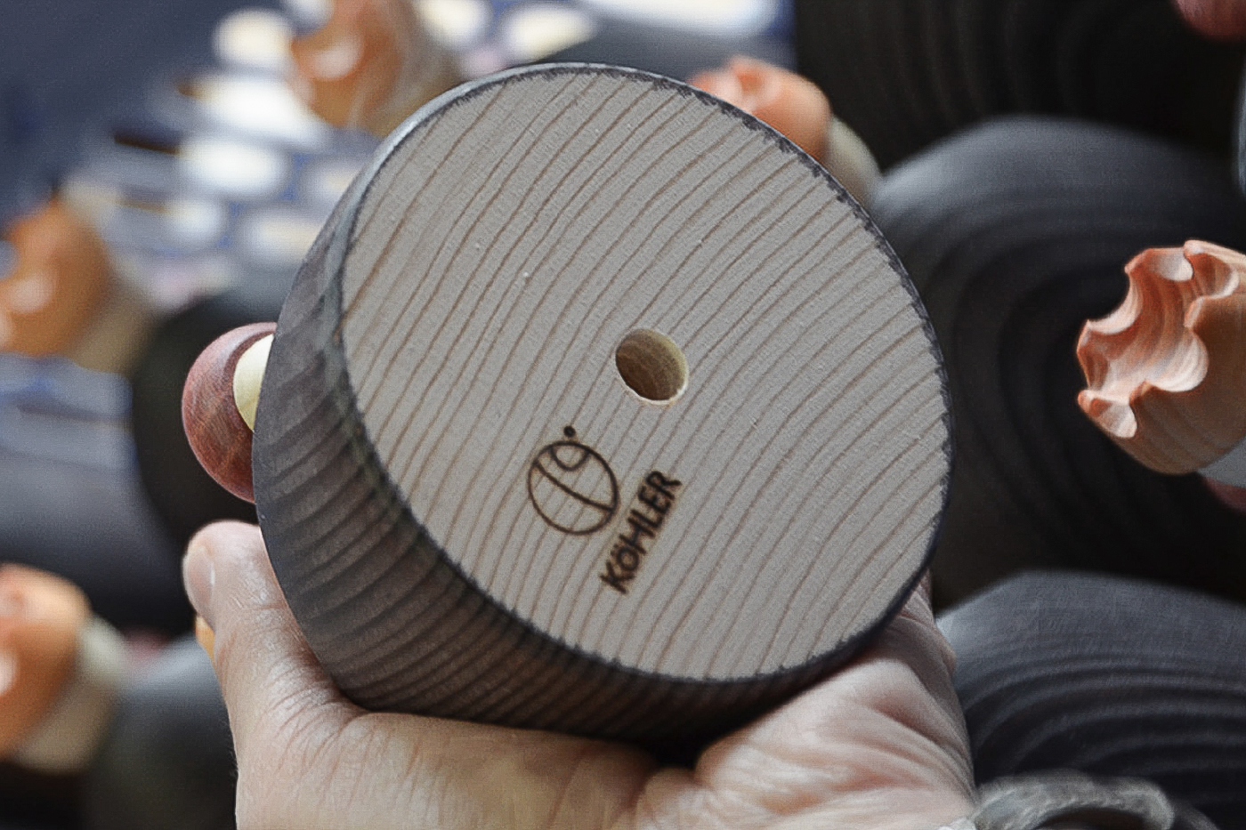 The filigree first cuts as well as choosing and assembling the turned components – that is even in the third millennium pure handicraft by concentrated working people who work with joy and passion. The grain of each component is aligned on one another consecutively. Depending on the figure, the glue-laminated bodies are getting stained, scumbled and then sanded by hand. With trained movements of the hand, fine sandpaper and patience, the basis for the later fine sanding is created. A further scumble with polish or varnish follows, which makes the gently sanded shape shining. The brand mark, that is applied in the end, reveals every small figure recognizable as originals from our manufacture.