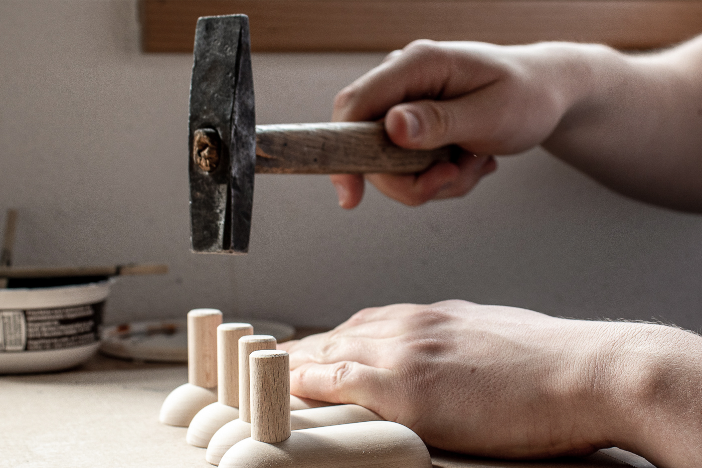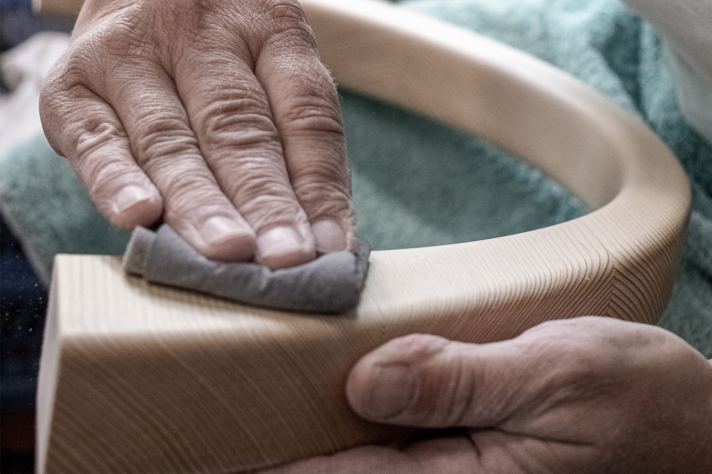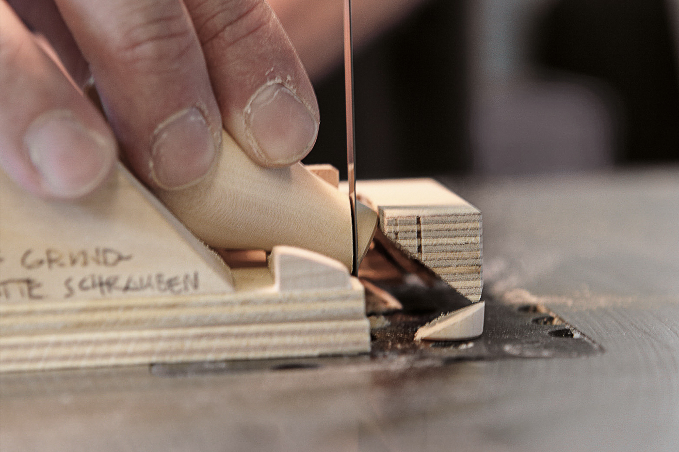 At first, they are conceived at the plotting board and refined in countless wooden designs again and again at the lathe. The basis for the workmanship of the material is caused in the choice of native wood, temperature-controlled storage and the slow process of drying. Thus, the possibilities of the natural material can be used best. The concentration on the basics can already be found in the production, for example in cutting or roughing out the wooden boards.