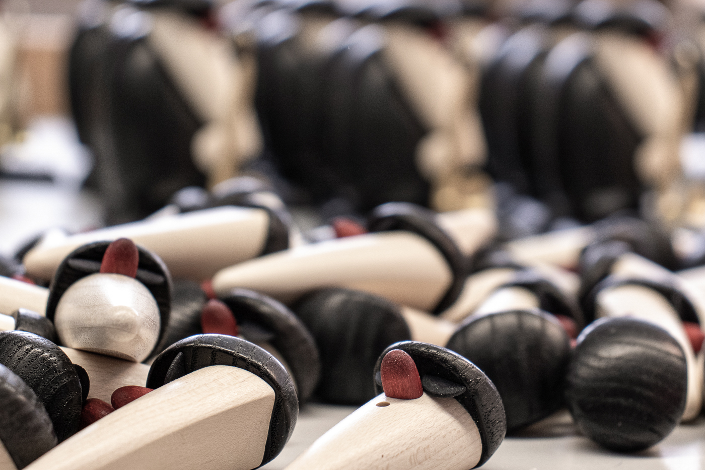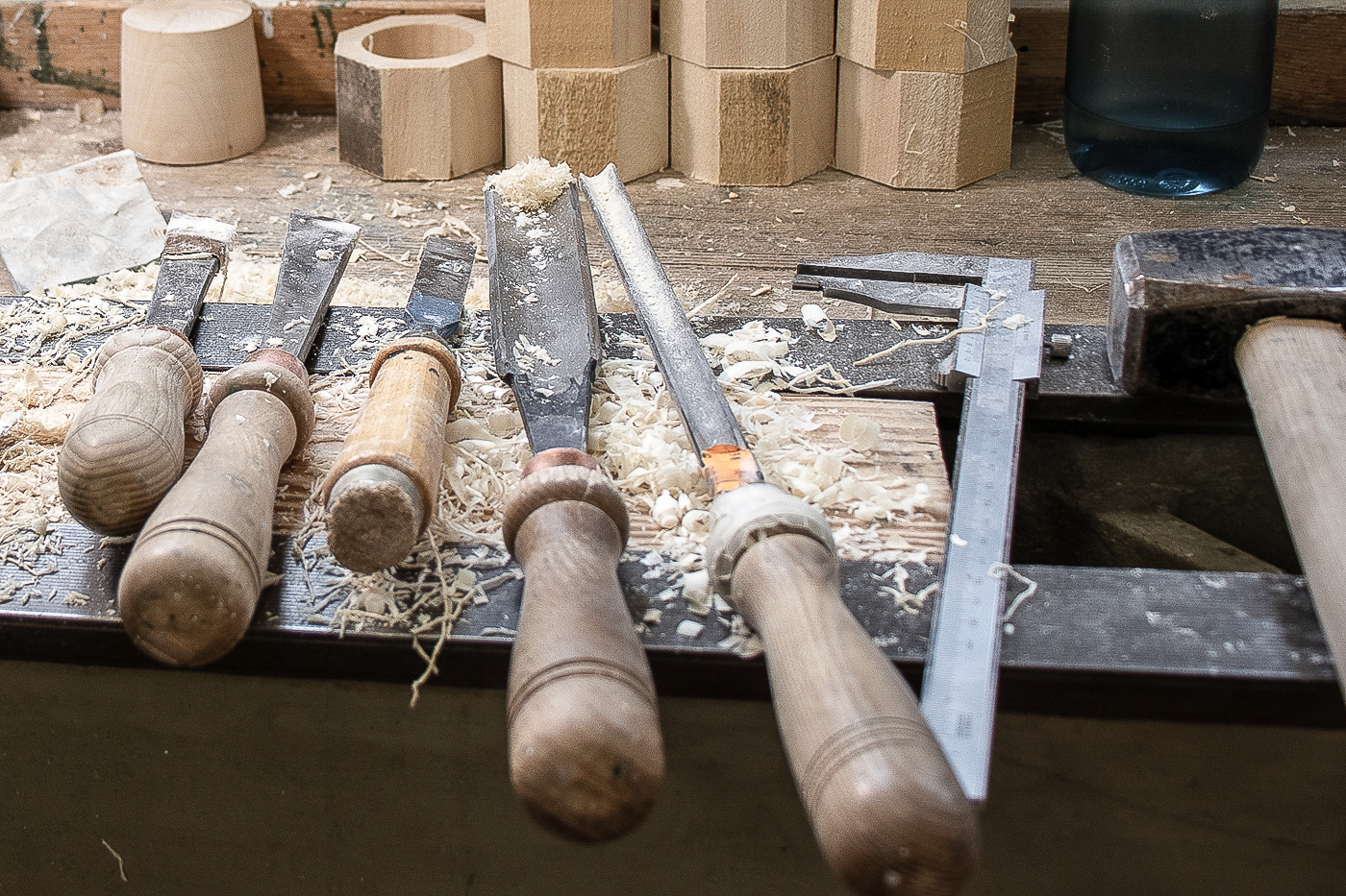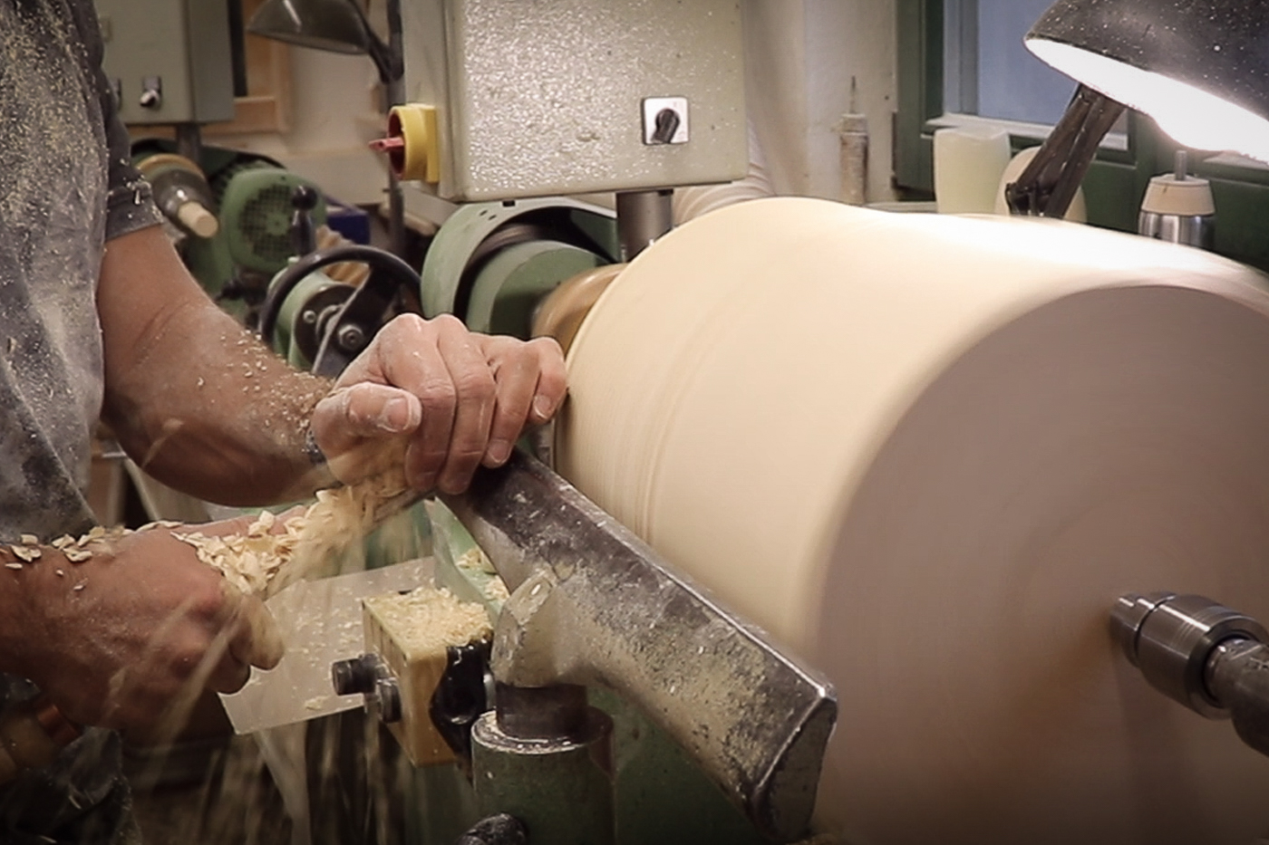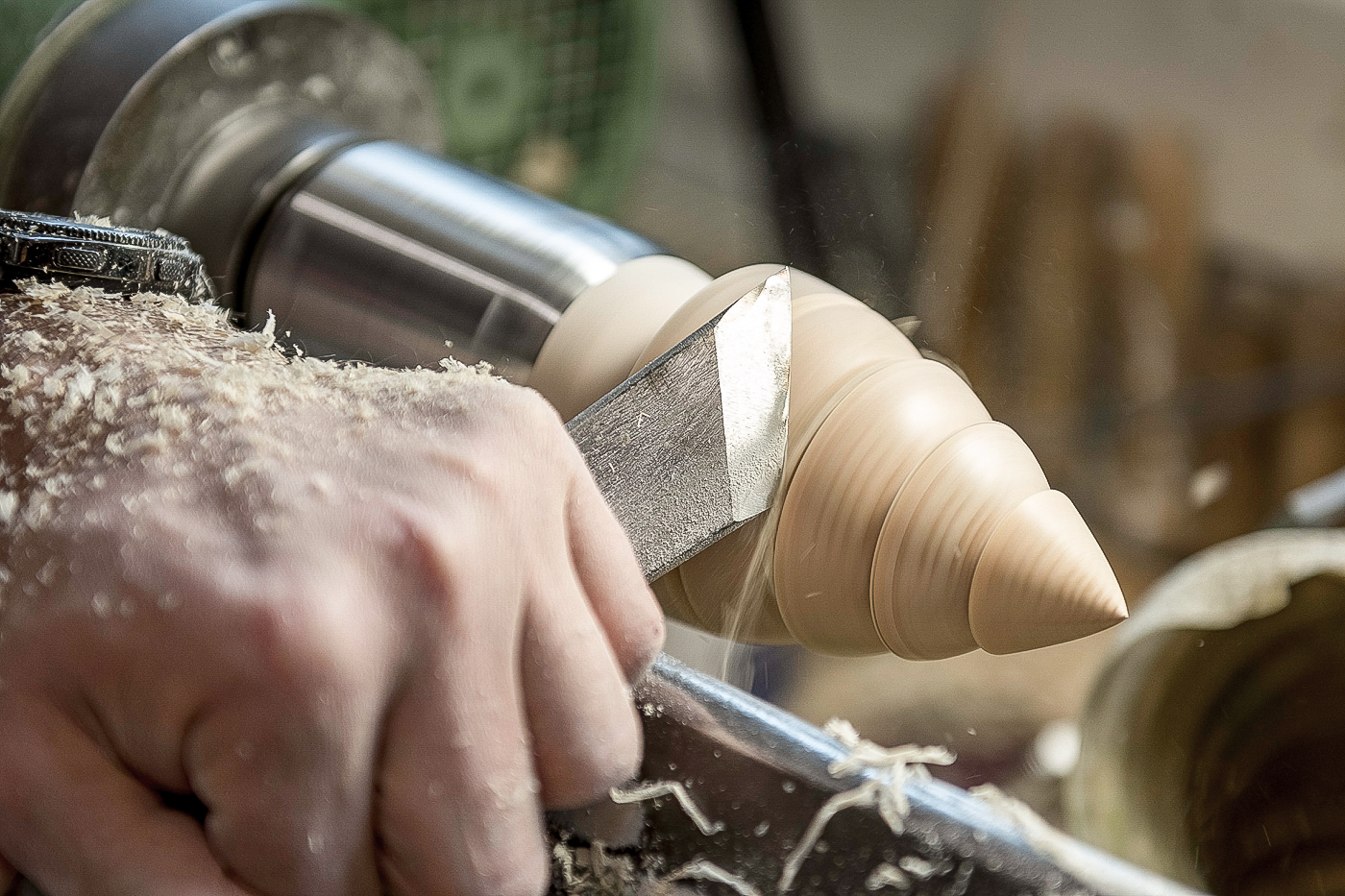 The marvellous smell of wood and the hum of the lathes and also the sound of iron in wood are in the air. Simple rollers emerge from the prefabricated square timbers. Out of it, the figures are turned – balls, trees or miscellaneous body parts for the later figures. One single inattentive movement and the piece is spoiled. Good sense of distance and craftmanship are decisive for the perfection of the finished piece. Many women work in our manufactory, probably because of their patience…