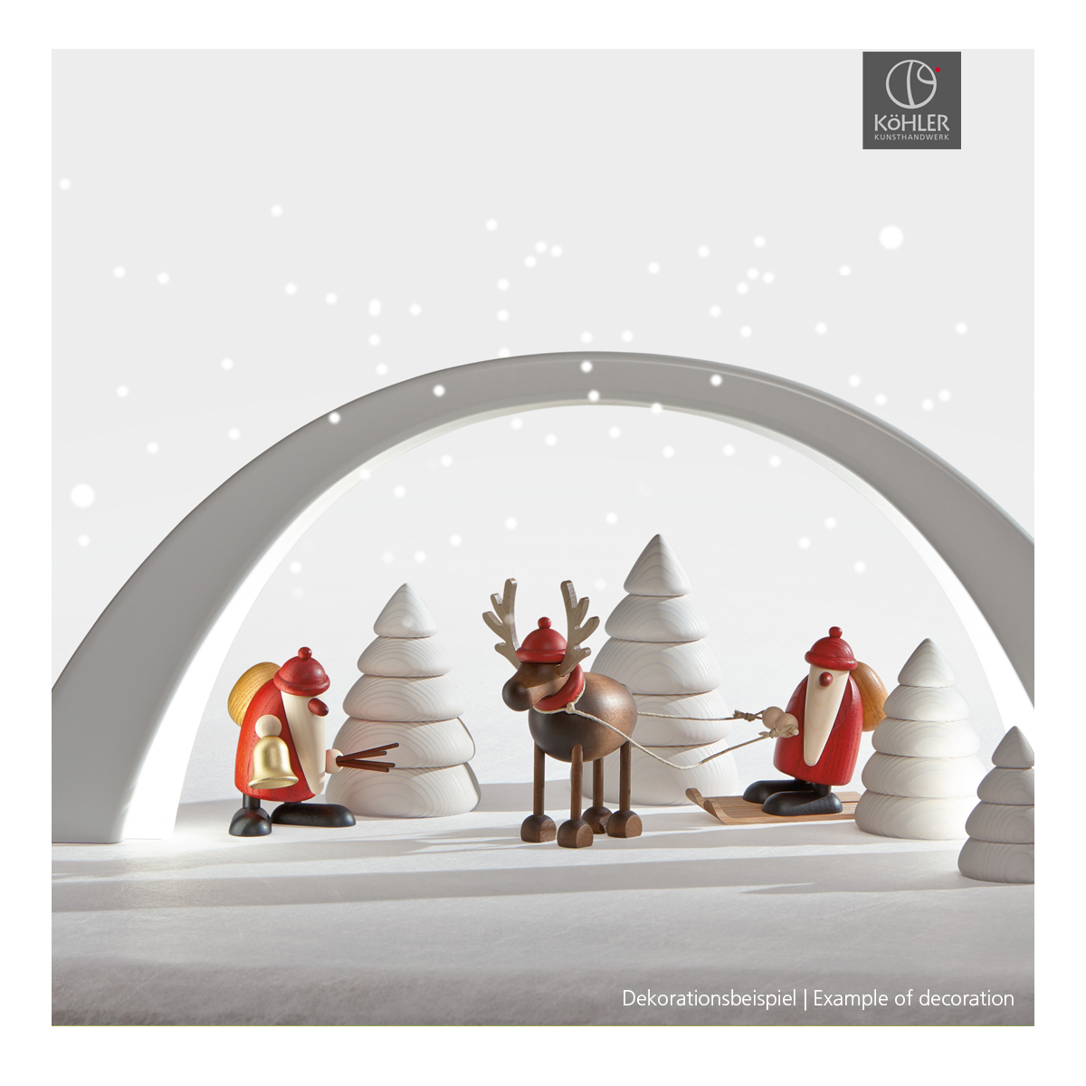 Der Bogen wird mit LEDs (austauschbar) der neuesten Generation gespeist. Er zeichnet sich durch einen äußerst geringen Energieverbrauch, eine angenehm warm-weiße Lichtfarbe und eine Lebensdauer von ca. 50.000 Stunden aus. Mit dem LichtBogen bereichert ein weiteres hochwertiges Produkt das Sortiment der Manufaktur. Durch einen speziell geschliffenen Kunstglaseinsatz strahlt das Licht weich nach innen ab und schafft für die im Bogen ausgestellten Figuren eine eindrucksvolle Inszenierung. Der steckerfertig mit einem Netzteil konfektionierte LichtBogen ermöglicht durch die integrierten Klinkenstecker eine verdeckte Kabelführung (z.B. durch eine Regalrückwand).
