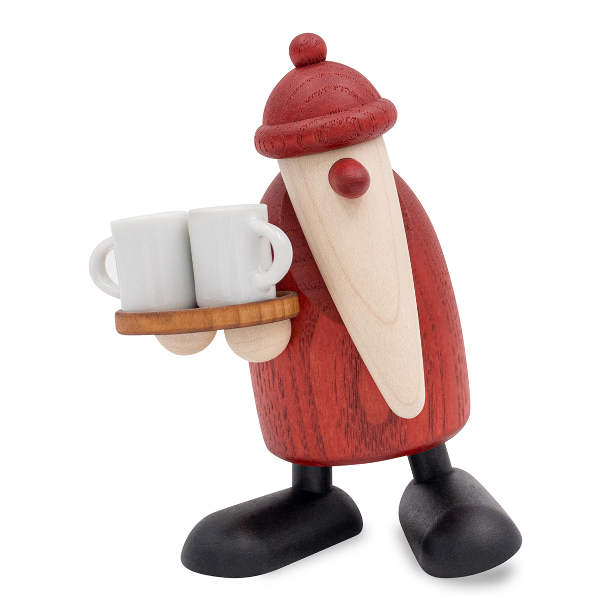 Beim derzeitigen Fachkräftemangel nimmt der Weihnachtsmann das Tablett gleich selbst zur Hand und sorgt für dampfenden Nachschub, der ganz sicher zu keiner Weihnachtsfeier und auch sonst nicht fehlen darf. Auf seinem aus gedämpftem Buchenholz gedrechseltem Tablett balanciert er drei glühweingefüllte Tassen aus echtem Porzellan und erweitert nun die Riege unserer „Geschmacksträger“.